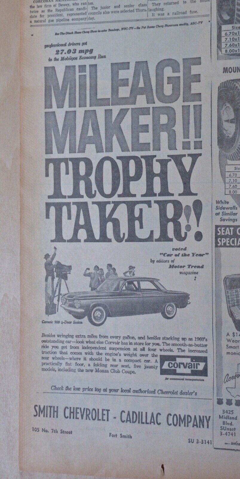 Title (ebay affiliate link): 1960 newspaper ad for Chevrolet - Corvair 200 Sedan, Mileage Maker Trophy Taker