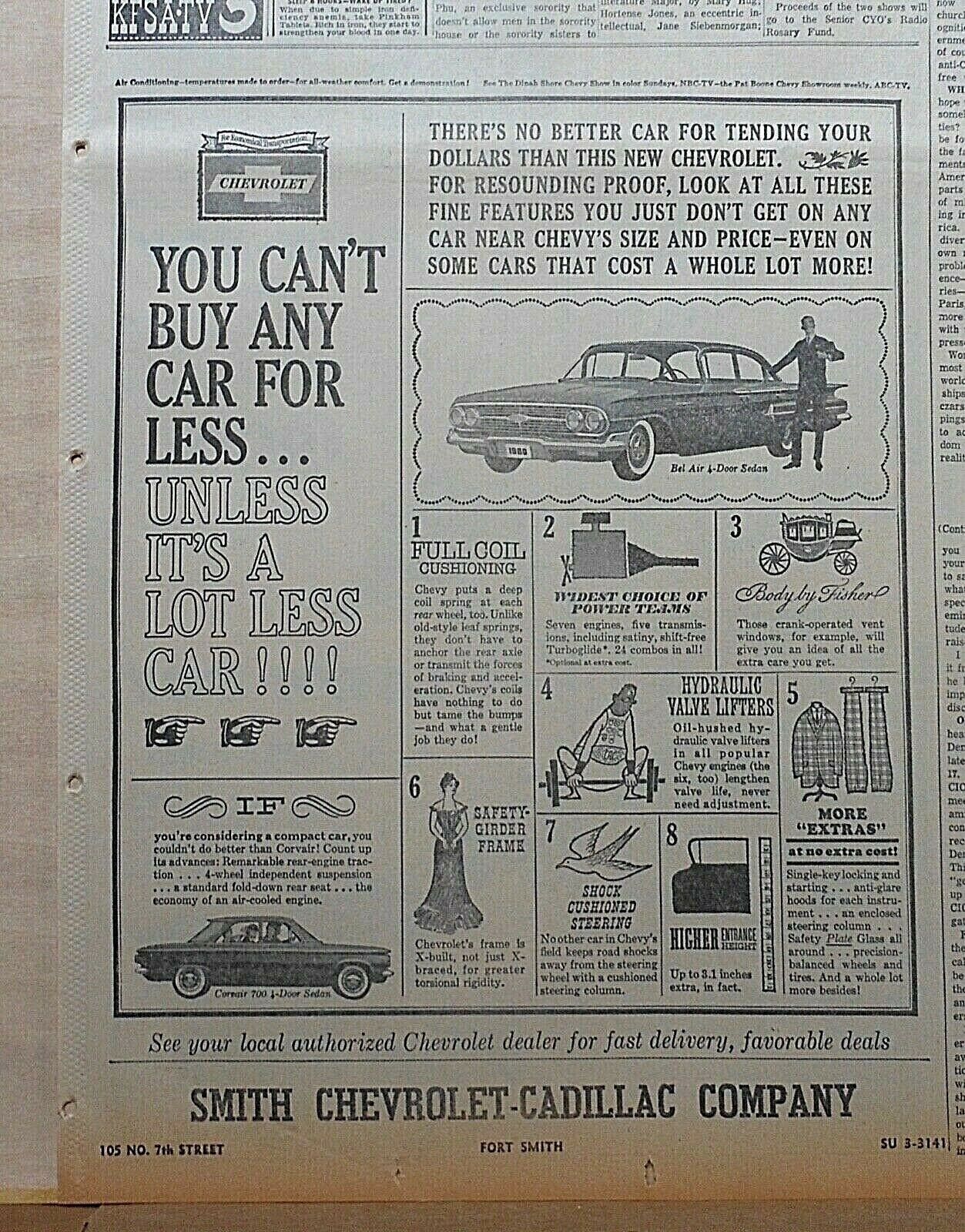 Title (ebay affiliate link): 1960 newspaper ad for Chevrolet - Bel Air, Corvair, Can''t buy any car for less