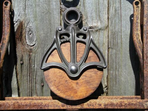 Title (ebay affiliate link): Antique/vintage CAST Iron AND WOOD PULLEY PRIMITIVE ORNATE RUSTIC DECOR FARM