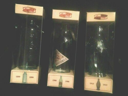 Lot of 3 coca cola reproduction commemorative bottles:1899, 1900, 1915 NEW w/box