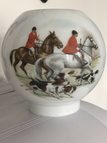 Title (ebay affiliate link): VINTAGE GLASS OIL LAMP SHADE HORSE AND HOUND HUNTING SCENE