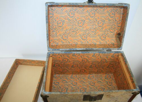 ANTIQUE DOLL WARDROBE TRUNK ORIGINAL W/ TRAY , CLOTH COVERED WOOD, PAPER INSIDE