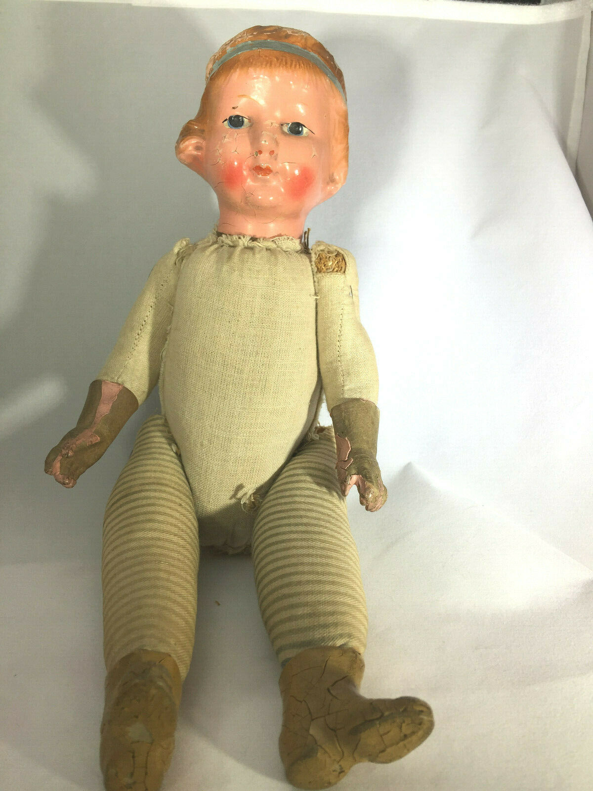 Title (ebay affiliate link): Antique Celluloid Head Doll Cloth Body Sawdust Filled 13"