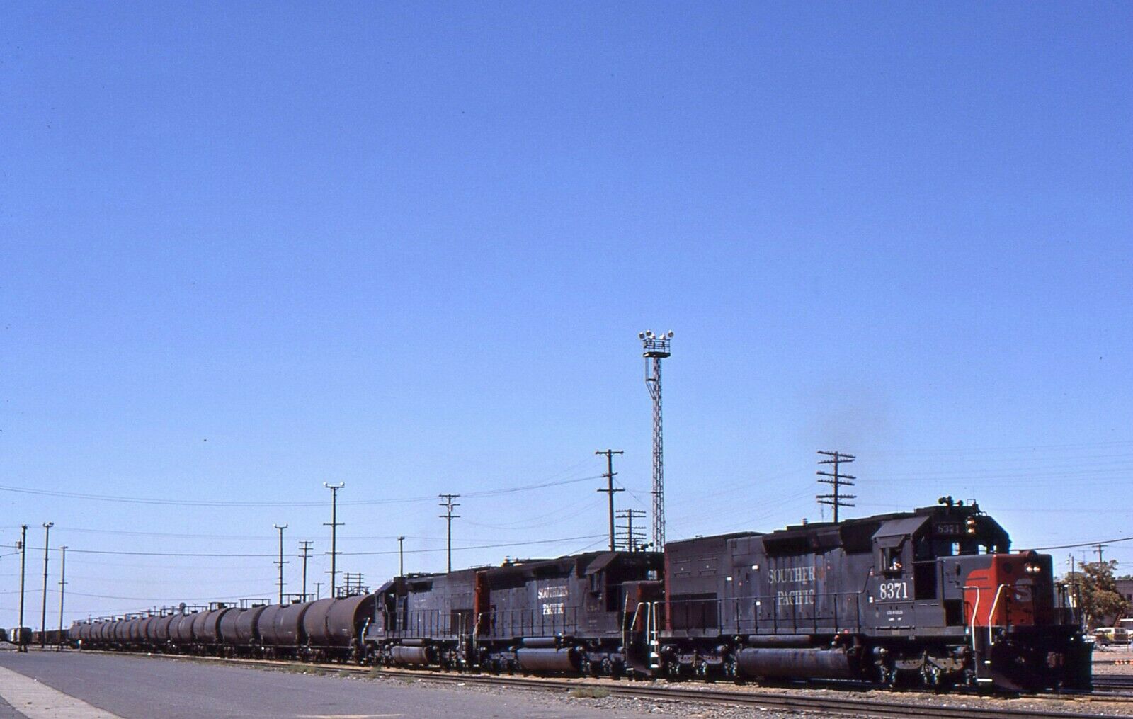 Title (ebay affiliate link): Original slide-Southern Pacific SD40T-2 #8371 & Train/ Roseville,CA.1987-Nice!