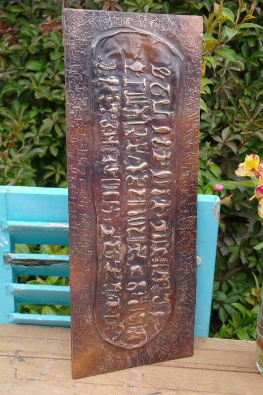 Title (ebay affiliate link): Vintage Rapa-Nui Hieroglyphics Signed Copper Wall Art Plaque MCM Modernist Chic