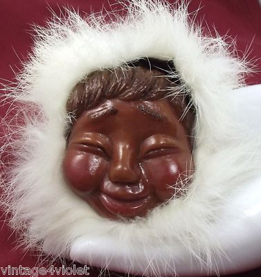 KITSCHY Vtg OLD PLASTIC Real Fur ESKIMO FACE Key Chain
