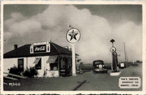 Title (ebay affiliate link): Kersey CO~Texaco Gas Station~Coca Cola Chest Vending Machine~Sign~1940s Postcard