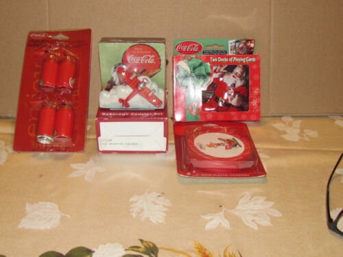 Title (ebay affiliate link): Set of Coca Cola coasters/playing cards/Tablecoth Weights.