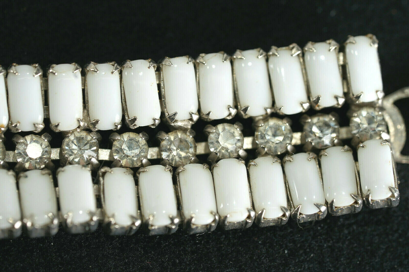Title (ebay affiliate link): VINTAGE SILVER TONE WITH MILK GLASS AND RHINESTONE BRACELET