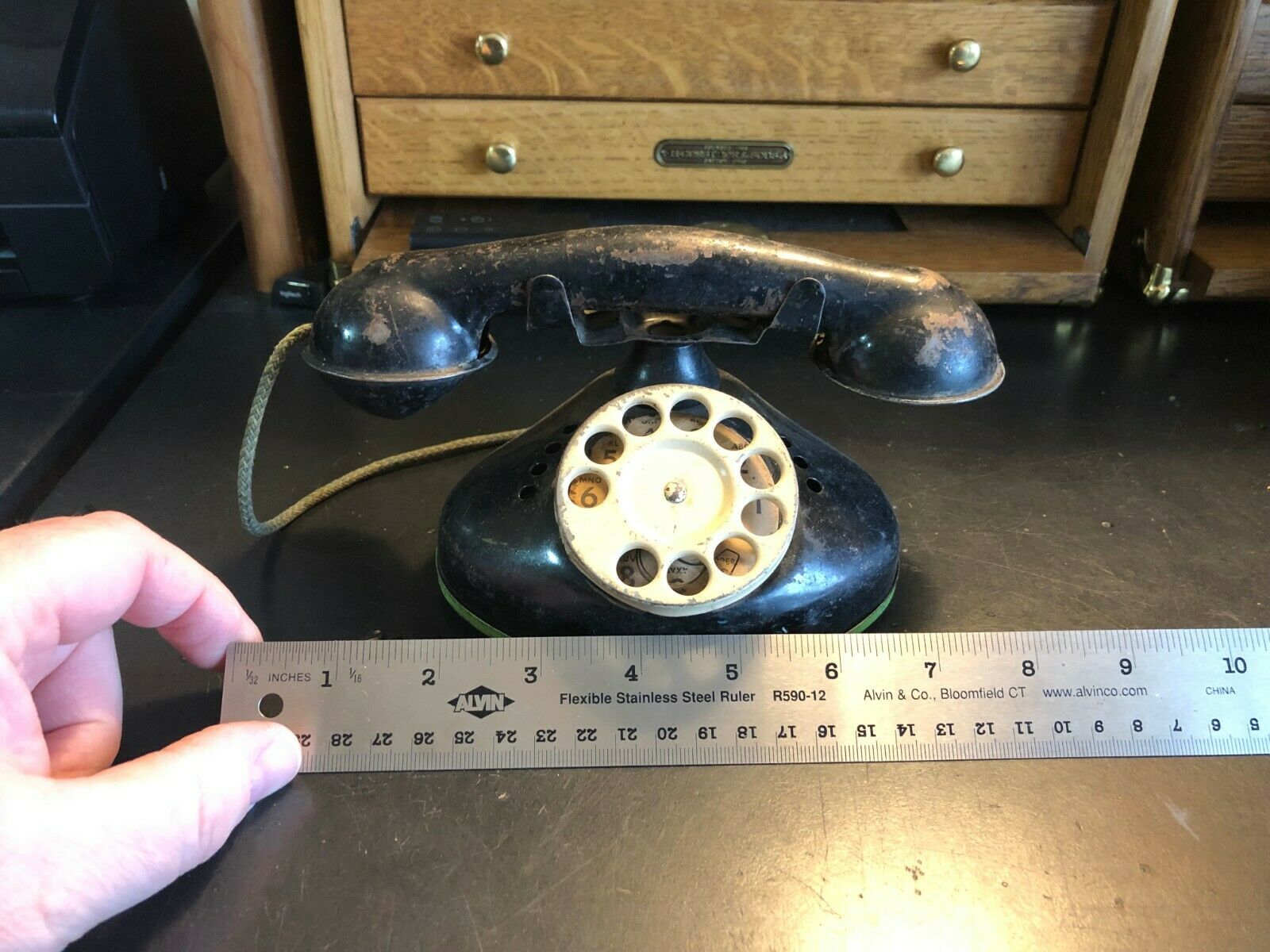 Title (ebay affiliate link): Primitive Antique Vtg Child''s Black Play Rotary Telephone Bell Phone Tin Toy