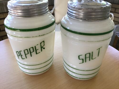 Retro Salt and Pepper Shakers With Green Stripes Hazel Atlas Milk Glass