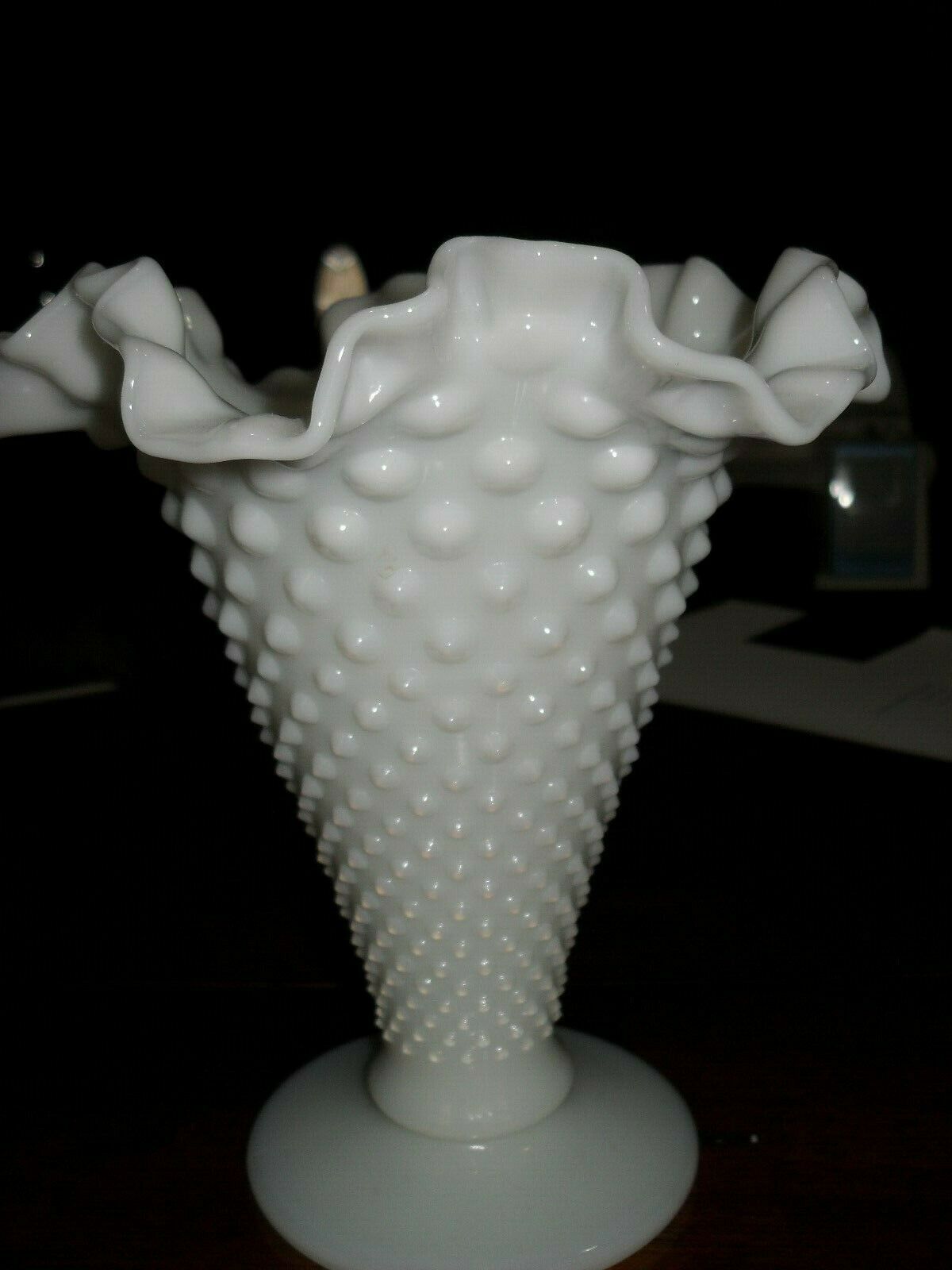 Fenton Hobnail MIlk Glass ruffle edged Trumpet Vase