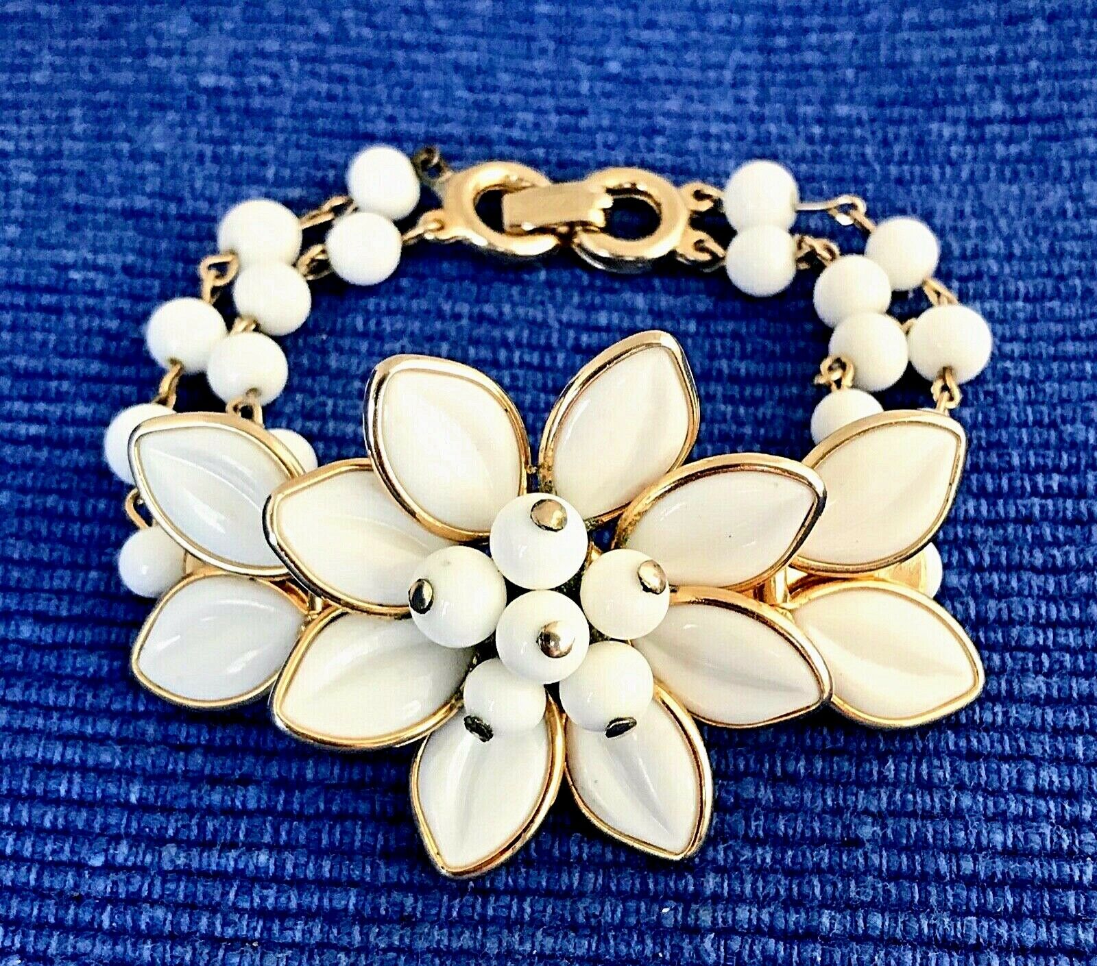 Vintage White Molded Milk Glass Flower Bead Braelet