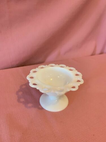 Title (ebay affiliate link): Vintage White Milk Glass Lace Edge Pedestal Footed Candy Dish Compote Bowl. X