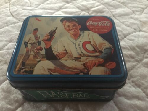 Title (ebay affiliate link): VTG Coca-Cola Delicious and Refreshing BASEBALL Themed Blue Metal Tin 3X5