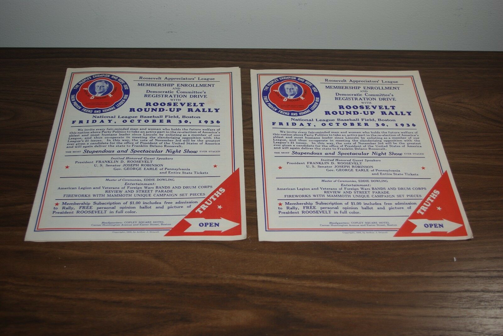 1936 Roosevelt Appreciator''s League Boston Round Up Rally Pamphlet Lot of (2)