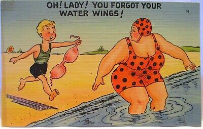 Title (ebay affiliate link): 1940s POSTCARD LADY YOU FORGOT YOUR WATER WINGS! BOY WITH LADYS BRA AT BEACH