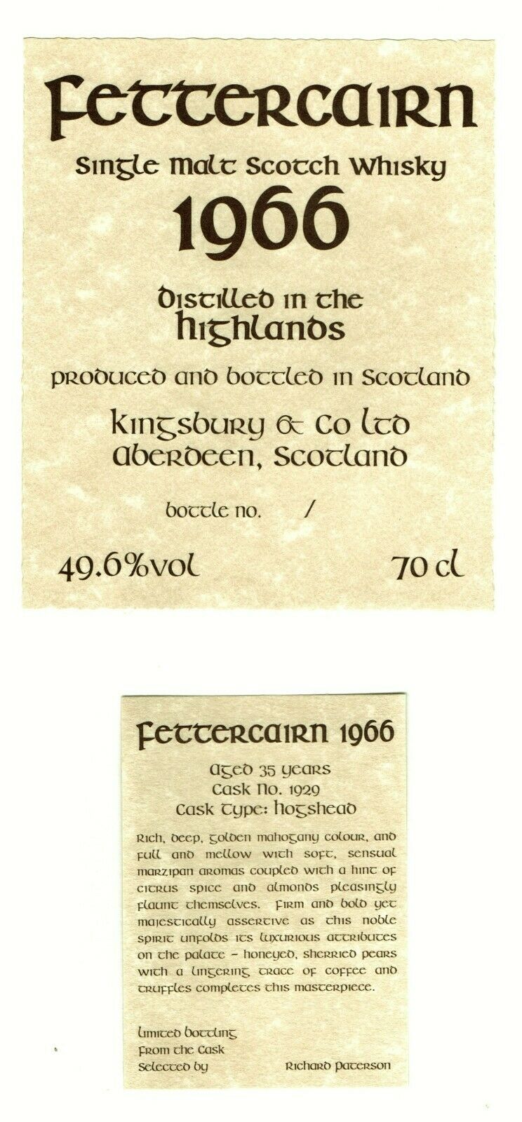 Fettercairn 1966 Single Malt Scotch Whisky label + back - Kingsbury & Co.