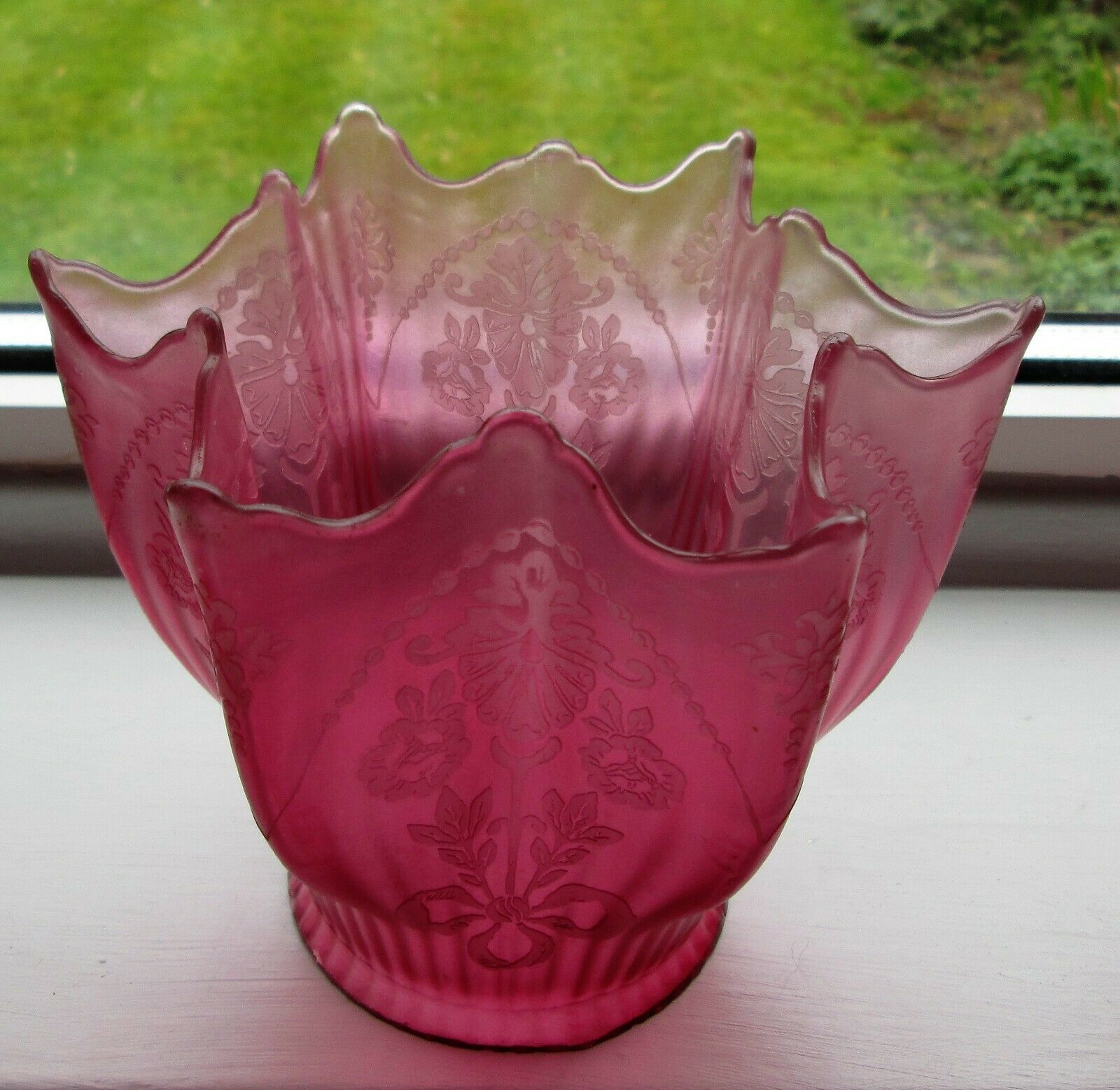 ANTIQUE VICTORIAN ART NOUVEAU CRANBERRY ETCHED GLASS OIL LAMP SHADE #B