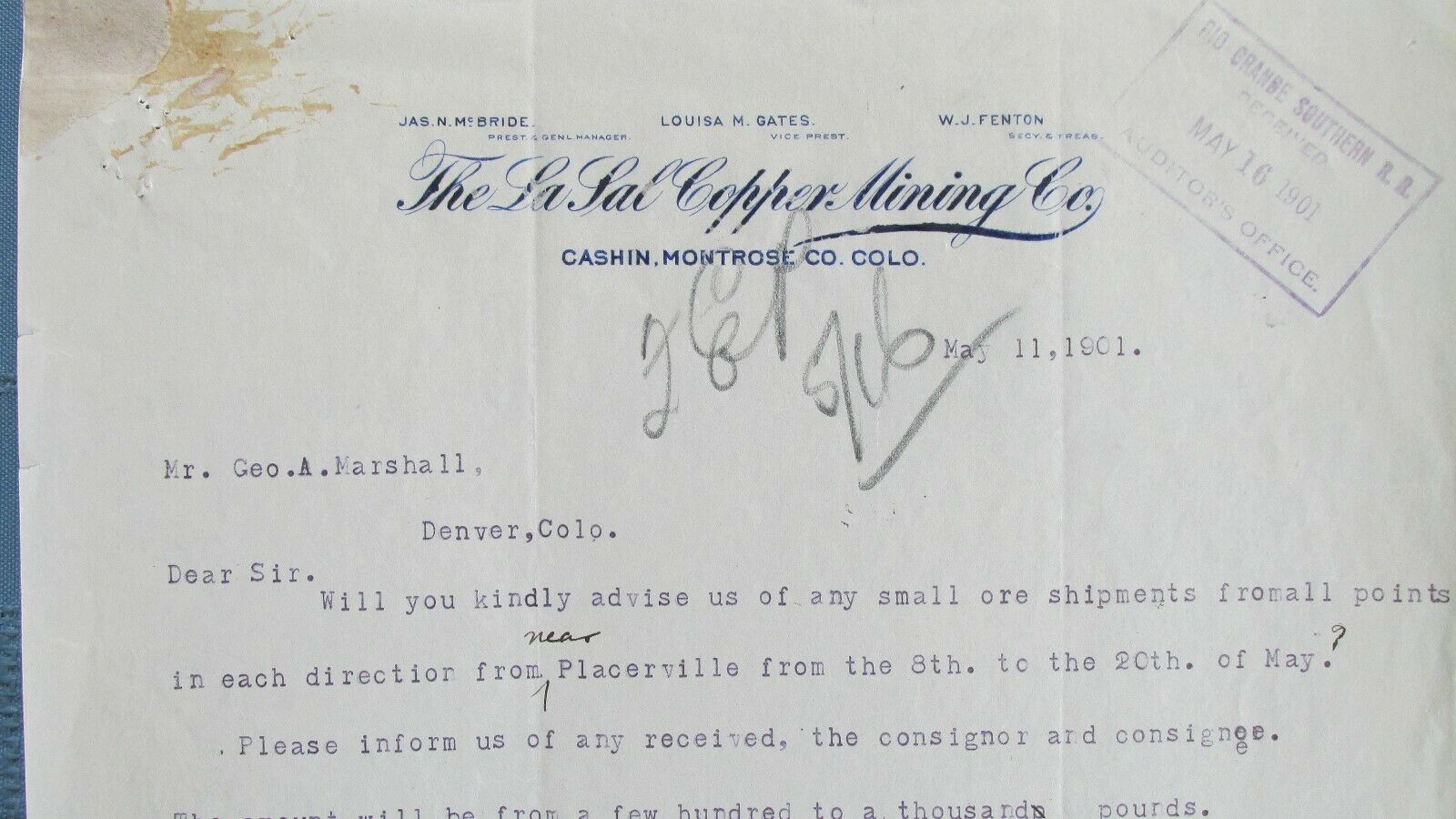 Title (ebay affiliate link): 1901 Cashin Colorado La Sal Copper Mining Letterhead-RGS Railroad Ore Shipment