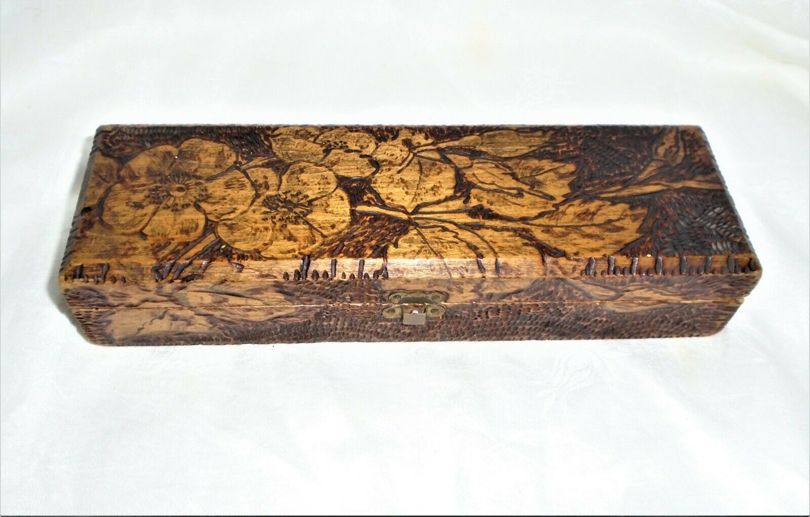 ANTIQUE VICTORIAN FLEMISH ART PENCIL BOX PYROGRAPHY CARVED WOOD