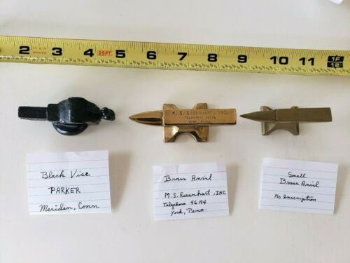 Title (ebay affiliate link): TWO (2) SMALL BRASS ANVILS & ONE (1) SMALL BLACK VICE