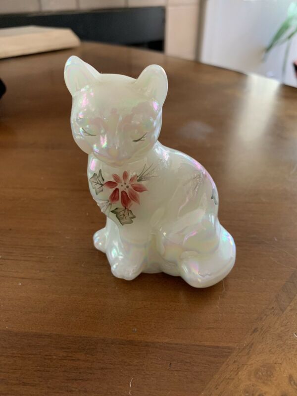 Title (ebay affiliate link): 4 Inch Tall Fenton Hand Painted Cat White Opalescent With Poinsettia Flowers