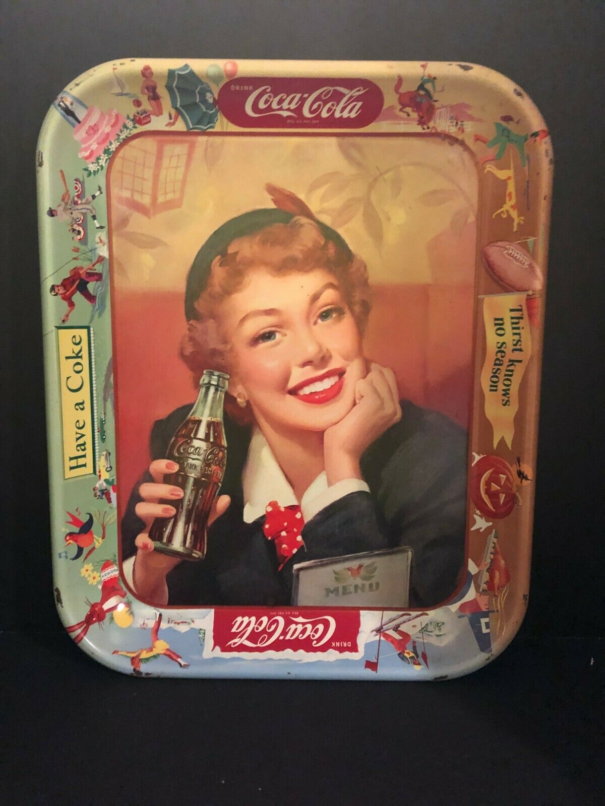 Title (ebay affiliate link): VINTAGE 1953 COCA COLA TIN LITHO ADVERTISING SERVING TRAY Thirst Knows No Season