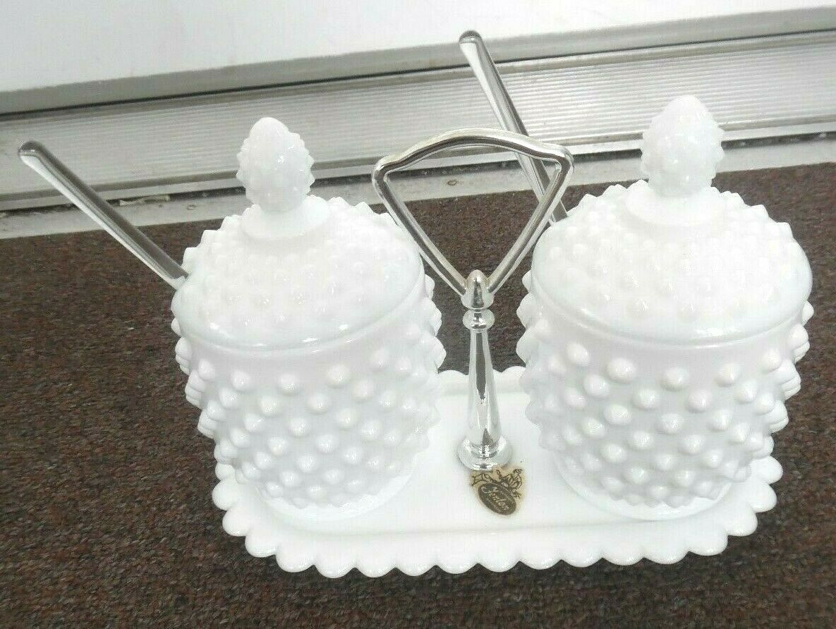 Title (ebay affiliate link): Fenton White Milk Glass Hobnail Jam & Jelly Condiment Bowls w/Serving Tray
