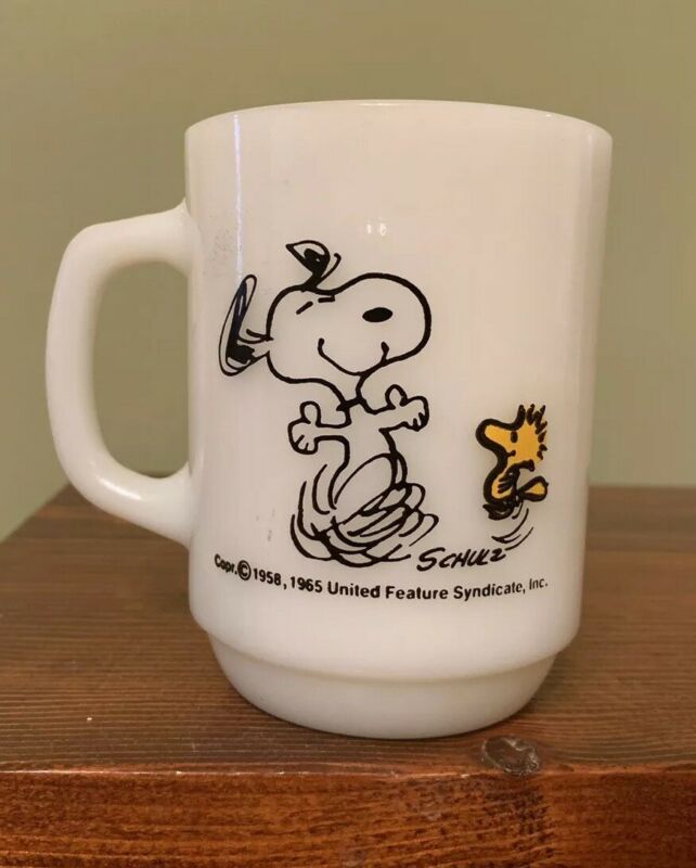 Title (ebay affiliate link): 1965 FIRE KING SNOOPY SCHULTZ " LIFE IS PURE JOY " MILK GLASS MUG