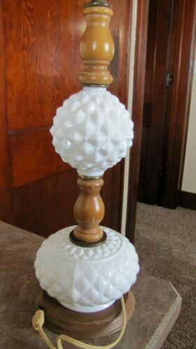 Title (ebay affiliate link): Mid Century Modern Tiered Quilted Diamond Hobnail Milk Glass Wood Electric Lamp