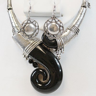 CHUNKY WESTERN ANTIQUE SILVER BLACK DECOR NECKLACE SET
