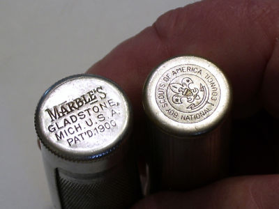 2 Antique Brass Match Safes 1 'MARBLES' 1 'BOYSCOUTS'