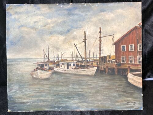 Title (ebay affiliate link): Antique Oil on Canvas Harbor Scene Boats Fishing Signed Wm Biloxi 16x20"