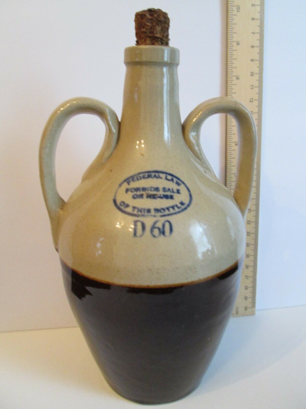 VINTAGE 2 HANDLE D60 WHISKEY JUG WITH CORN COB STOPPER