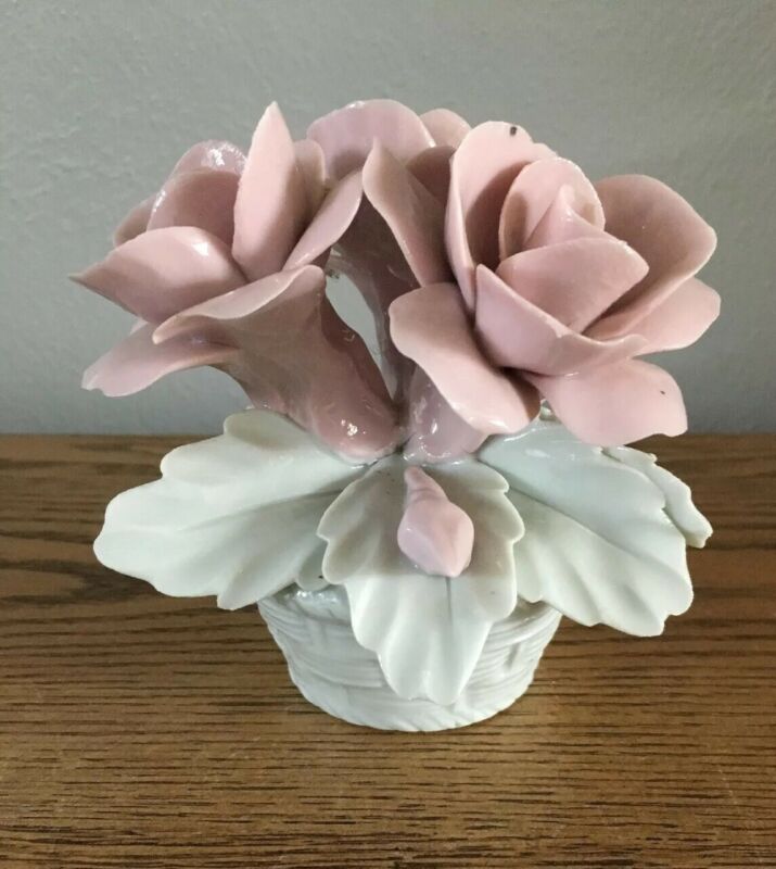 Title (ebay affiliate link): Vintage NUOVA CAPODIMONTE Porcelain White Woven Basket W Pink Roses Rosebuds