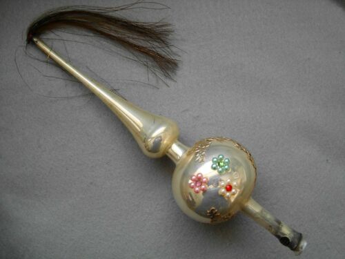 Title (ebay affiliate link): VINTAGE BLOWN GLASS TREE TOPPER W/ TINSEL TASSEL, BEADED & DRESDEN FLOWERS -BOX
