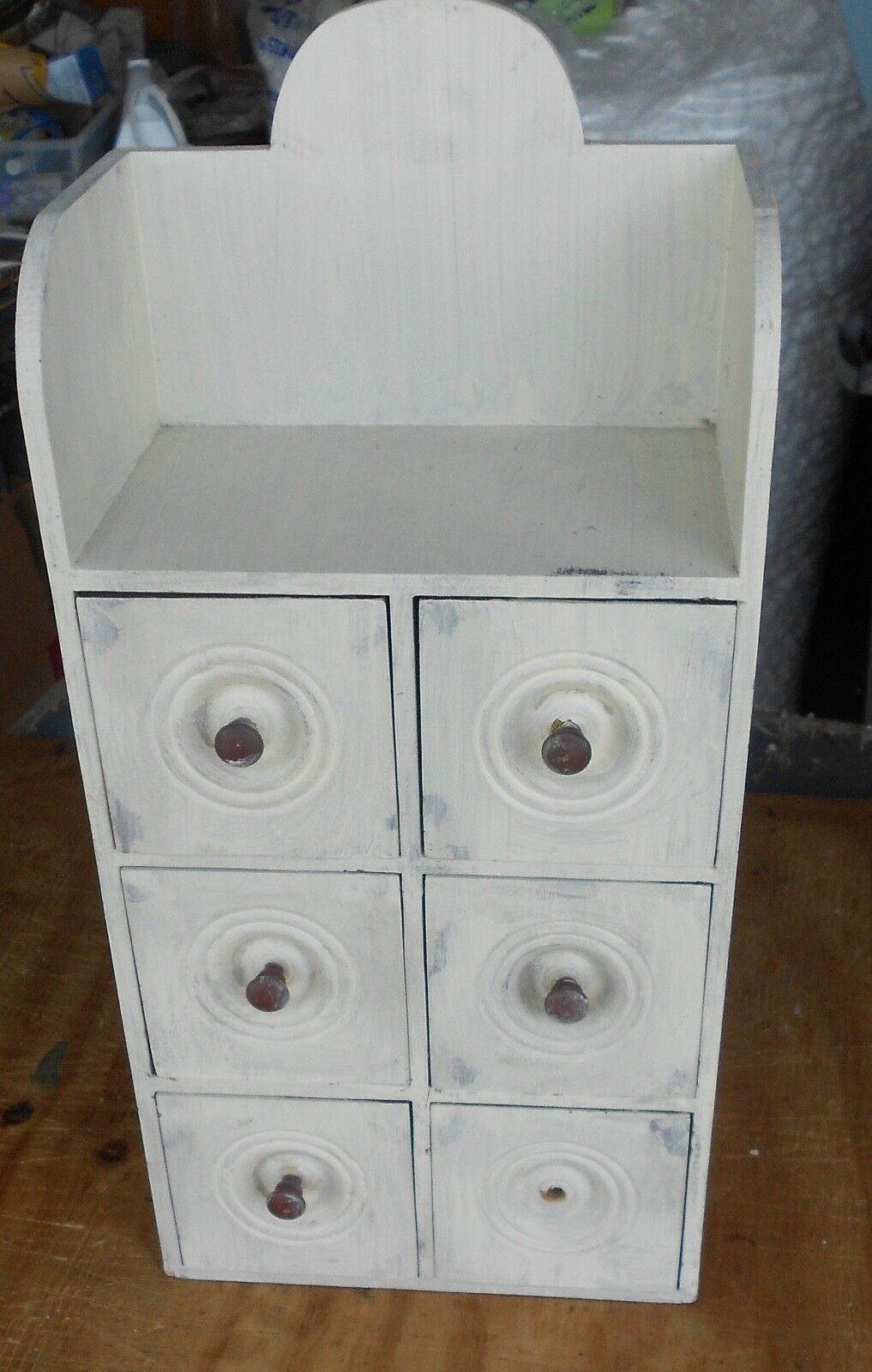 Vintage Primitive Wooden White Country 6 Drawers Spice Cabinet
