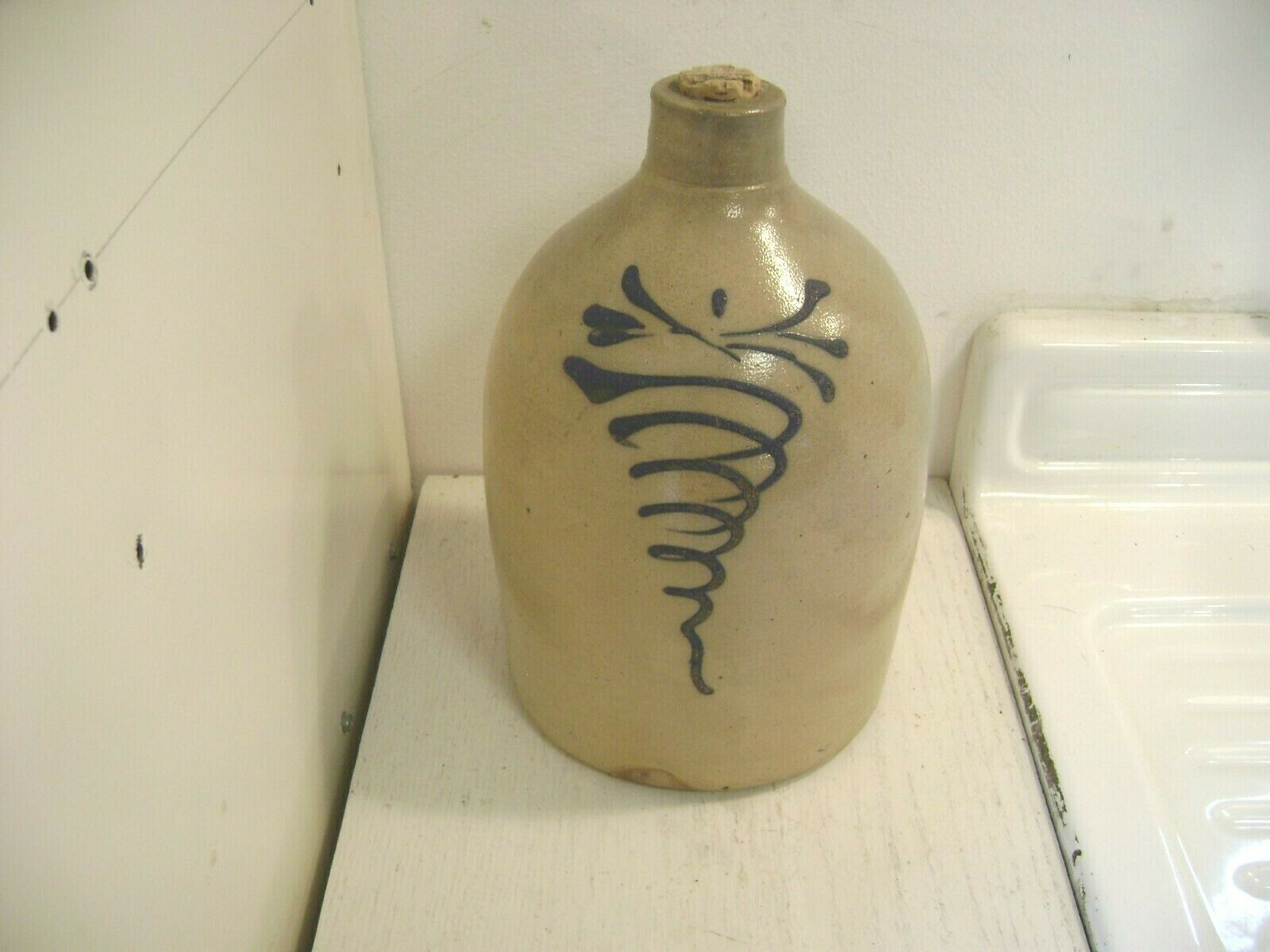VINTAGE SALT GLAZE JUG WITH COBALT BLUE DESIGN ORIGINAL 12 IN HIGH