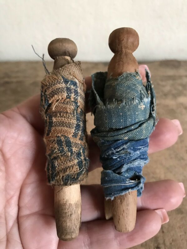 Title (ebay affiliate link): 2 Early Antique Blue Brown Homespun Wool Calico Wrapped Old Clothespins AAFA