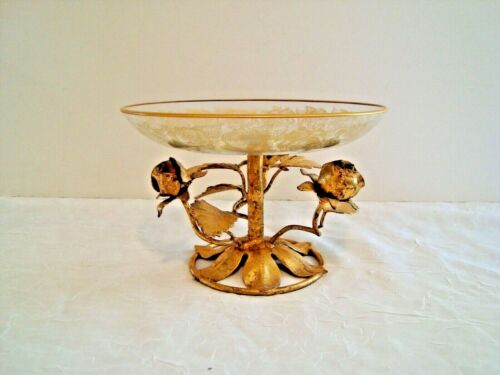 Vintage Italian Tole Toleware Candy Dish ~Lots of Gold Transferware Roses