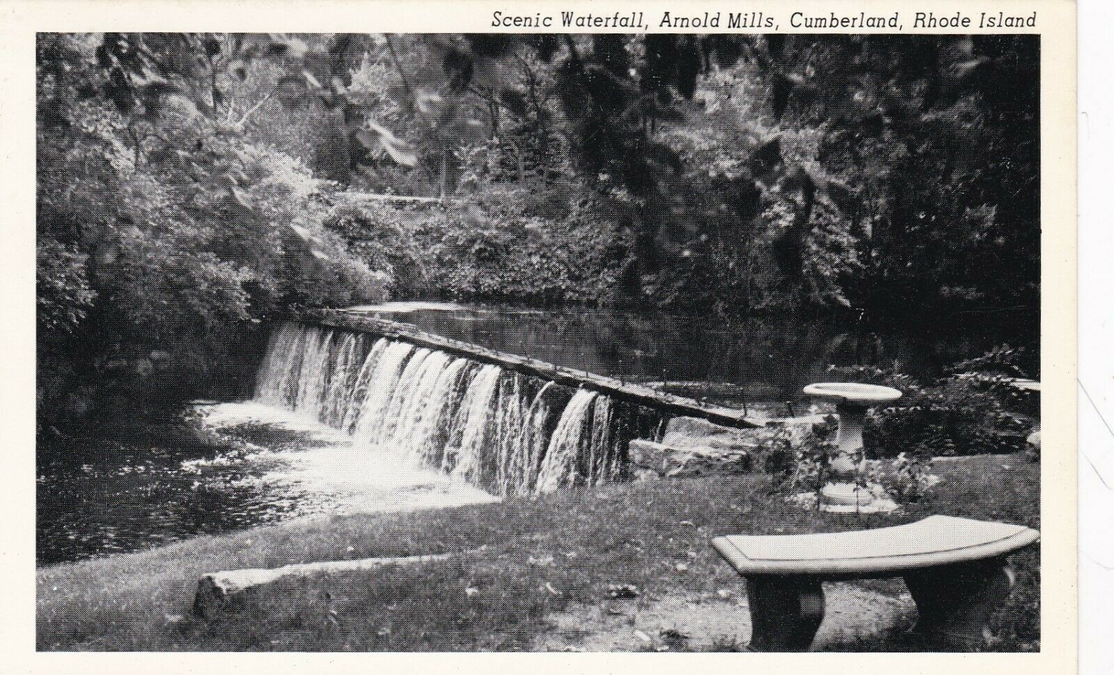 Arnold Mills, Cumberland, RI, Waterfall, with Bench and Birdbath, Unused Postcar