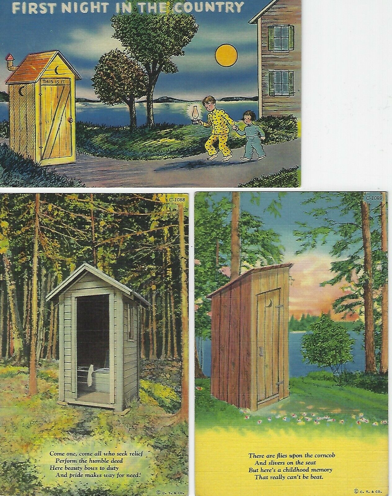 Title (ebay affiliate link): 3 Comic Postcard OUTHOUSES--scenery, interior, IN THE COUNRTY children