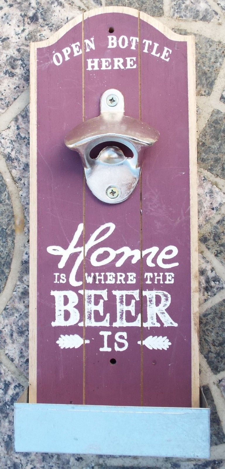 Wall Mounted Bottle Opener with Catcher Tray. Home is Where The Beer Is. Alcohol