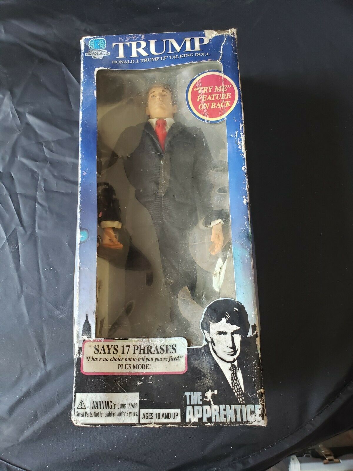 Title (ebay affiliate link): Donald Trump 12" Talking Doll The Apprentice, never been opened/poor condition