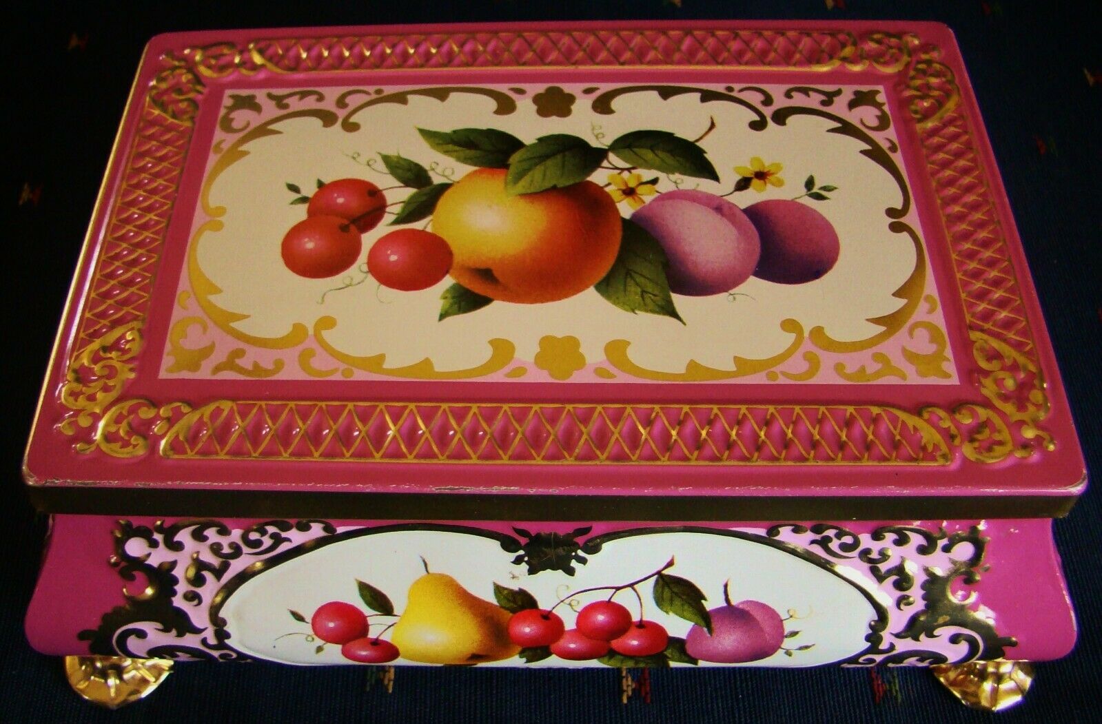 Vintage Western Germany Ornate Footed Tin Trinket Box Peach, Plums, Cherries