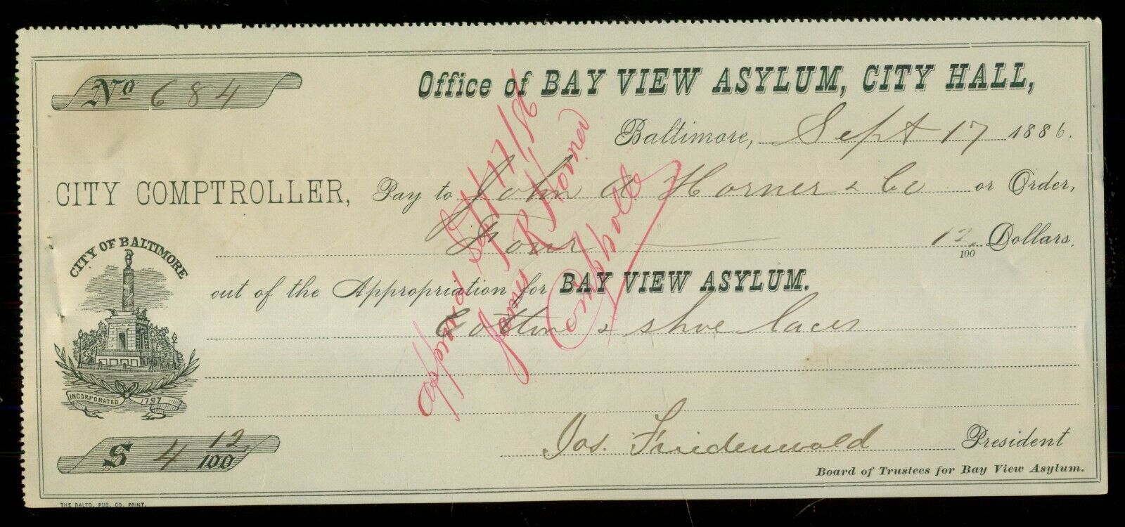 1886 "Bay View Asylum" Appropriations Receipt - J. Friedenwald Signed-Balto.,MD