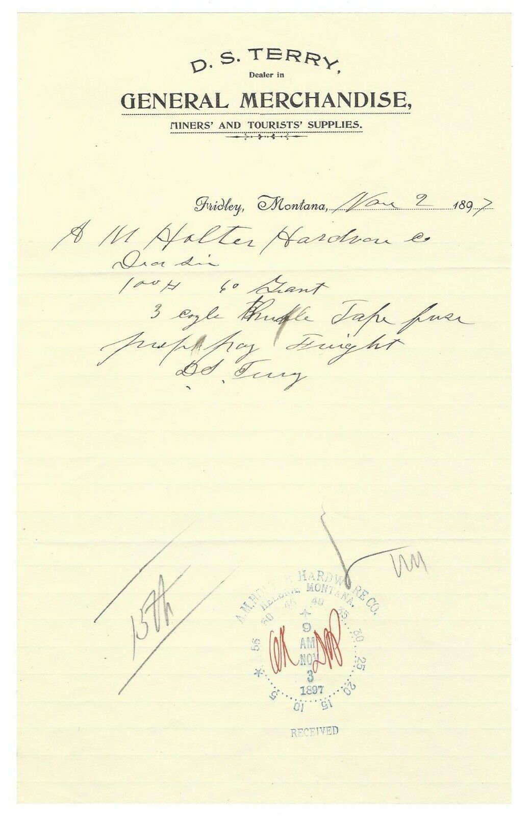 1897 Fridley, Montana Business ordering fuses by DS Terry Miners'' and Tourists''