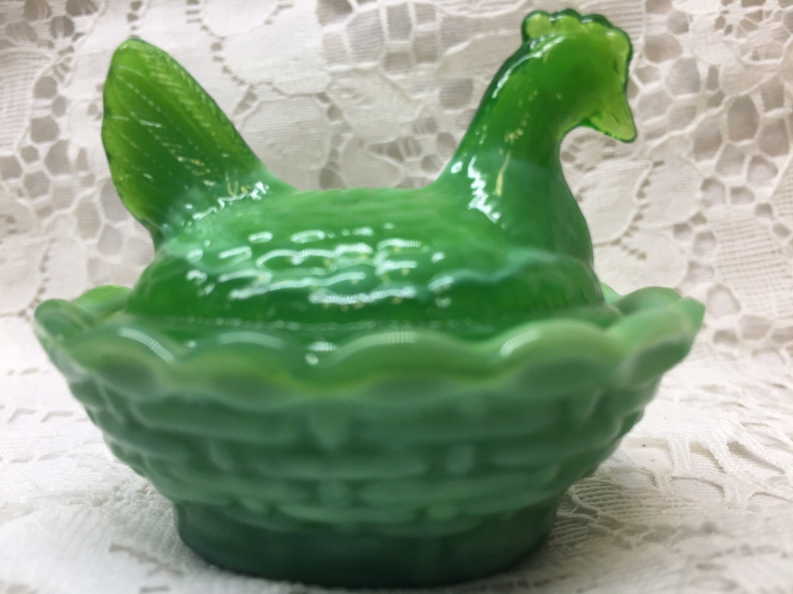Title (ebay affiliate link): Green Jadeite Milk glass salt celt hen / chicken on nest basket dish rooster art