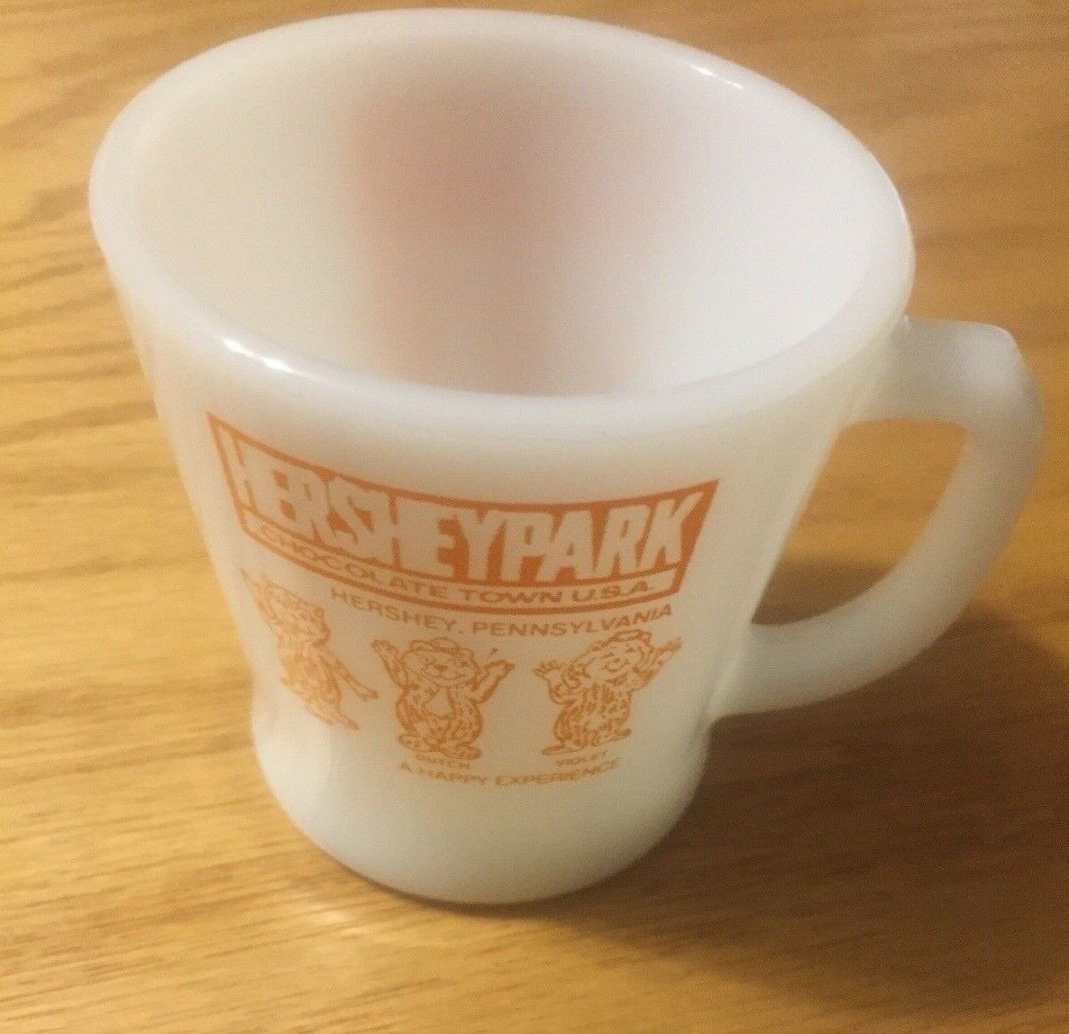 Title (ebay affiliate link): Vintage Hershey Park Chocolate Milk Glass Coffee Mug Chocolate Town USA Rare
